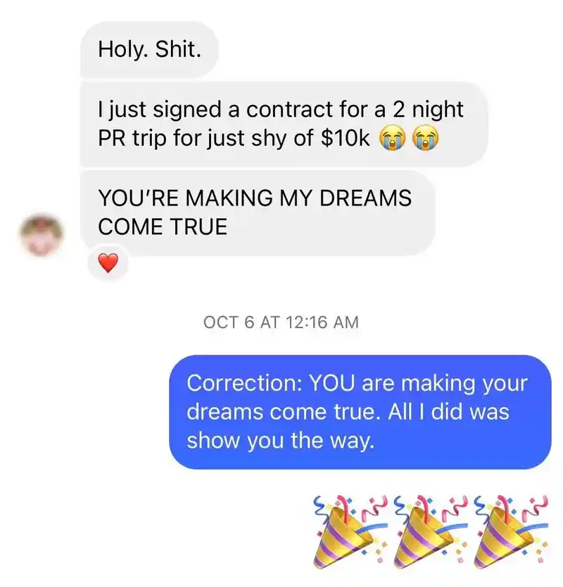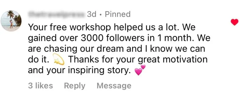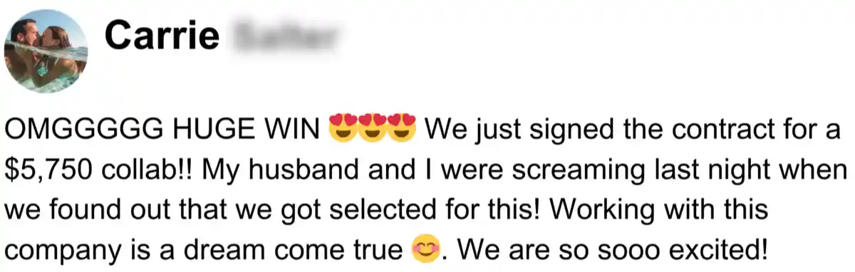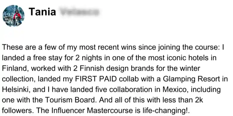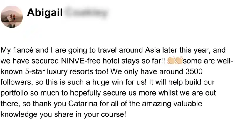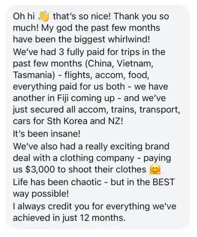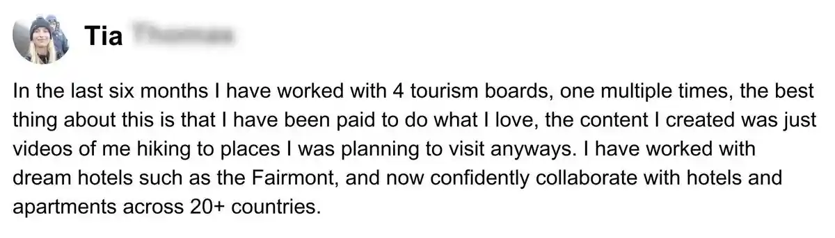 I started a new Instagram account that has grown to 92k, and my TikTok account has grown to 142k followers. I’m consistently landing multiple 4-figure deals with incredible brands like the Hilton, MasterCard, and Tourism Boards every month. I’m so happy I took a chance on myself!